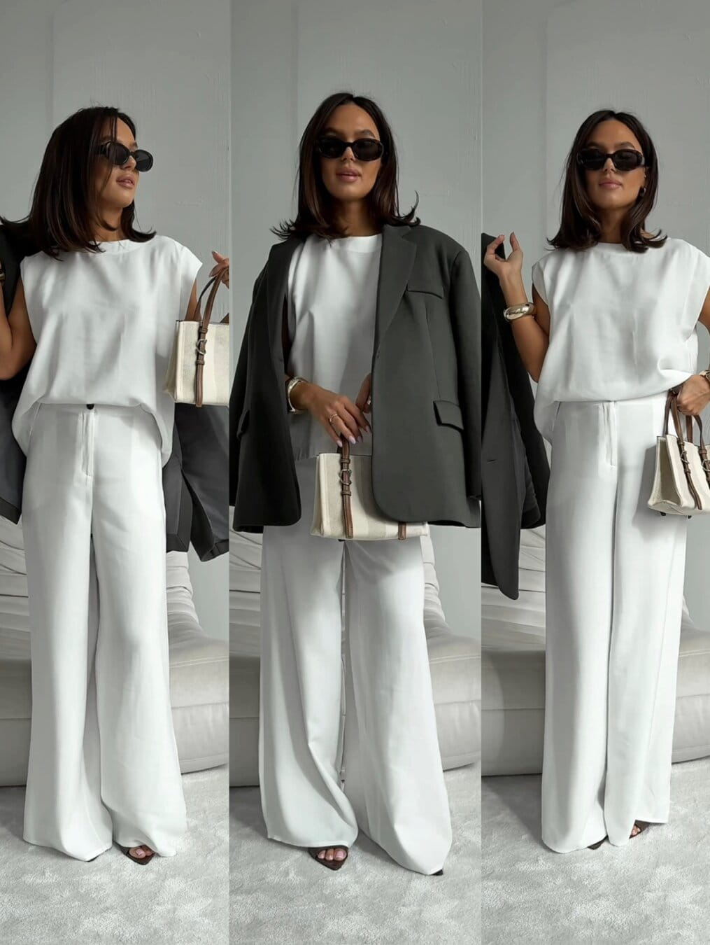 Jeśli lubisz eksperymentować, można dodać odrobinę koloru – na przykład torebkę w intensywniejszym odcieniu lub ciekawe akcesoria