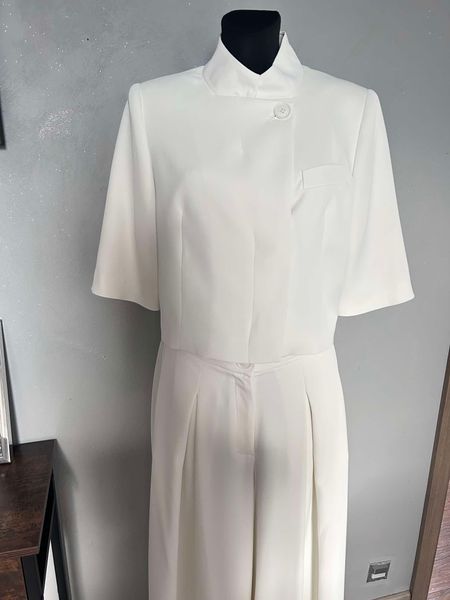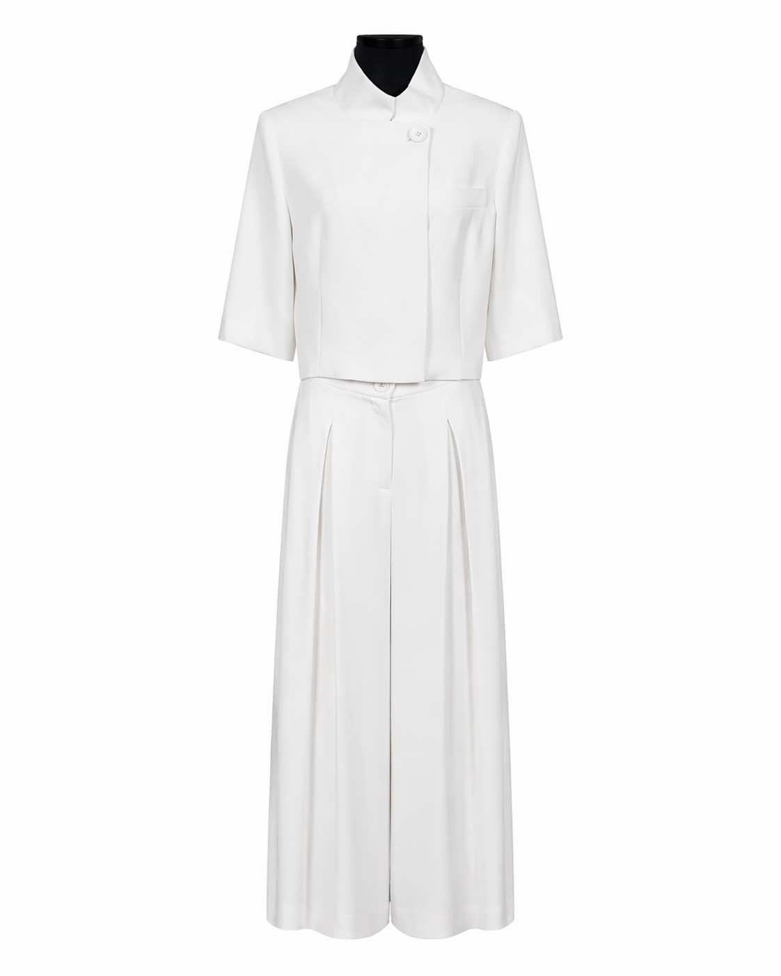 Elegancki Komplet Wizytowy – Nowoczesny Szyk w Stylu PalazzoOdkryj wyrafinowaną alternatywę dla klasycznej sukienki. Nasz dwuczęściowy komplet wizytowy to propozycja dla kobiet, które cenią minimalistyczną elegancję połączoną z najnowszymi trendami high fashion. Idealnie wyważone proporcje i szlachetny fason sprawiają, że jest to zestaw stworzony na wyjątkowe okazje.Design, który modeluje sylwetkę