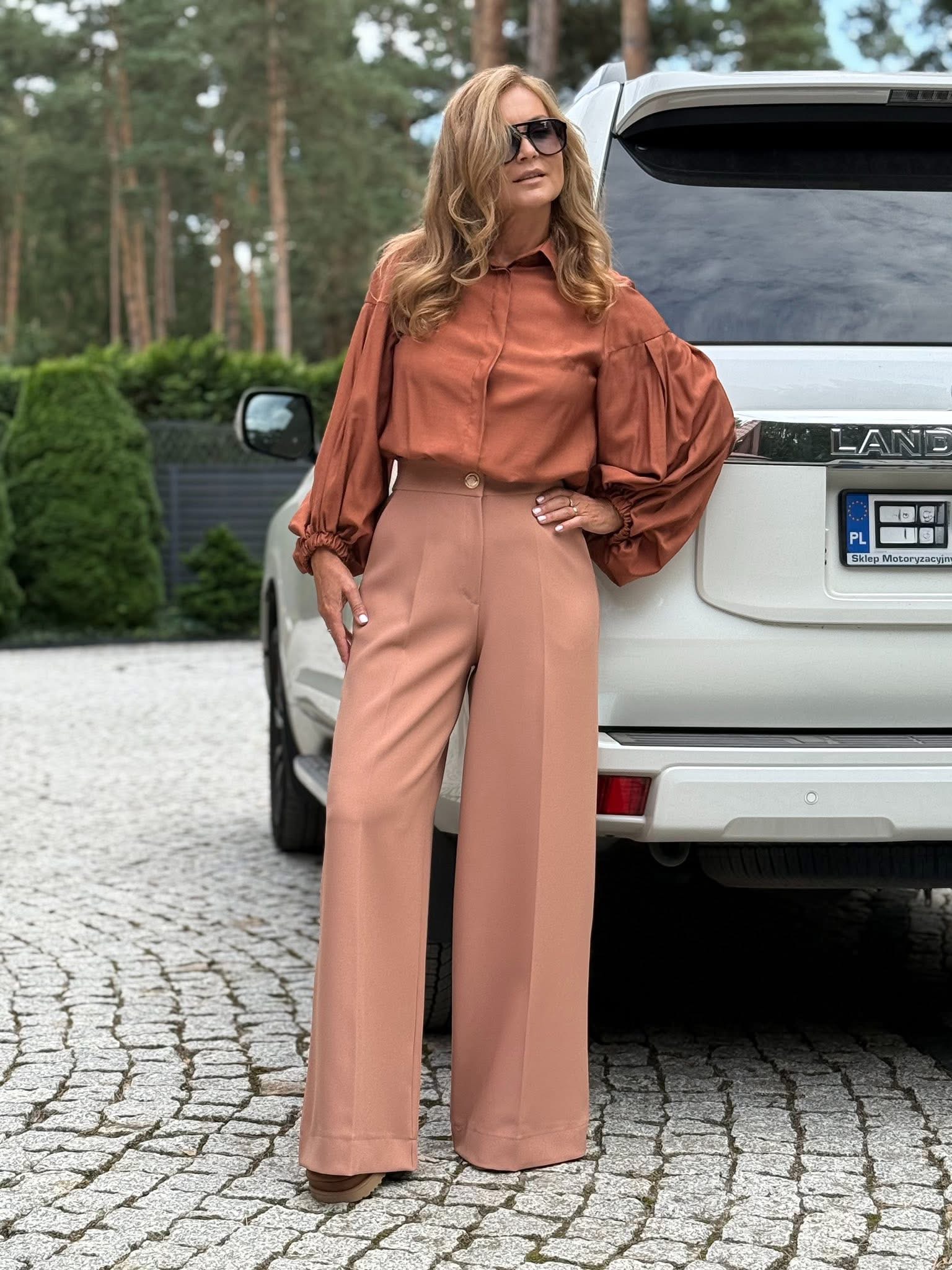 Koszula w odcieniu ceglanej miedzi wyróżnia się efektownymi, szerokimi rękawami zakończonymi