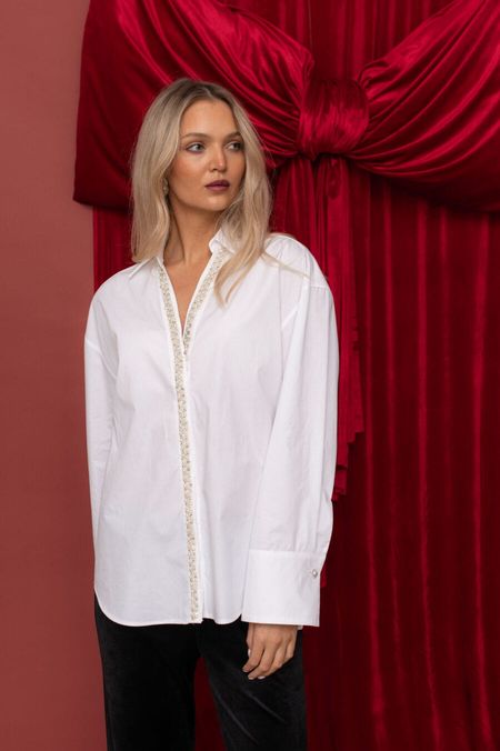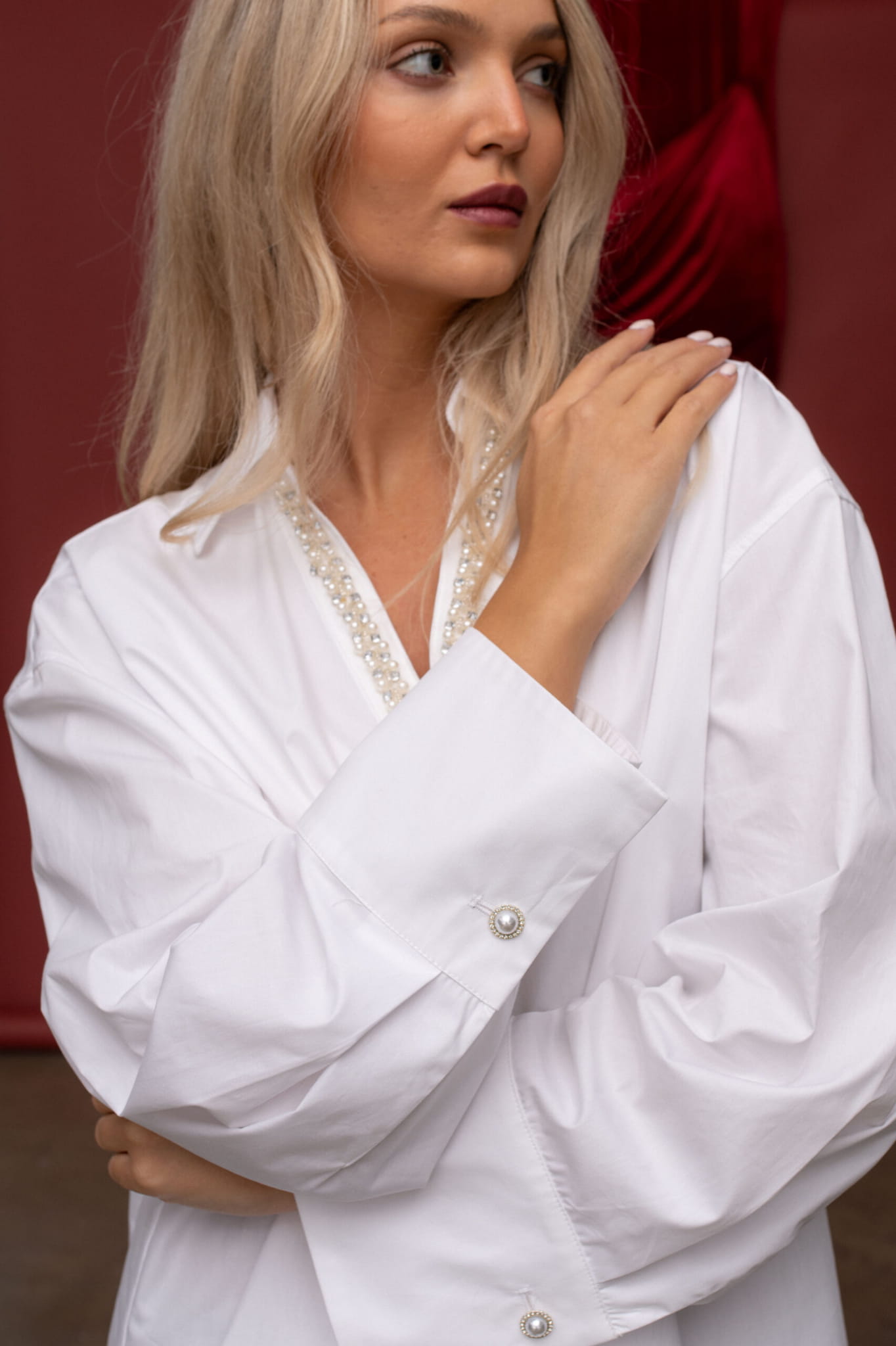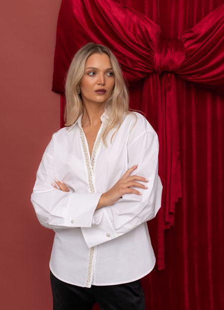 Biała koszula z perełkami to elegancka i ponadczasowa część garderoby, która dodaje szyku i subtelnej elegancji.