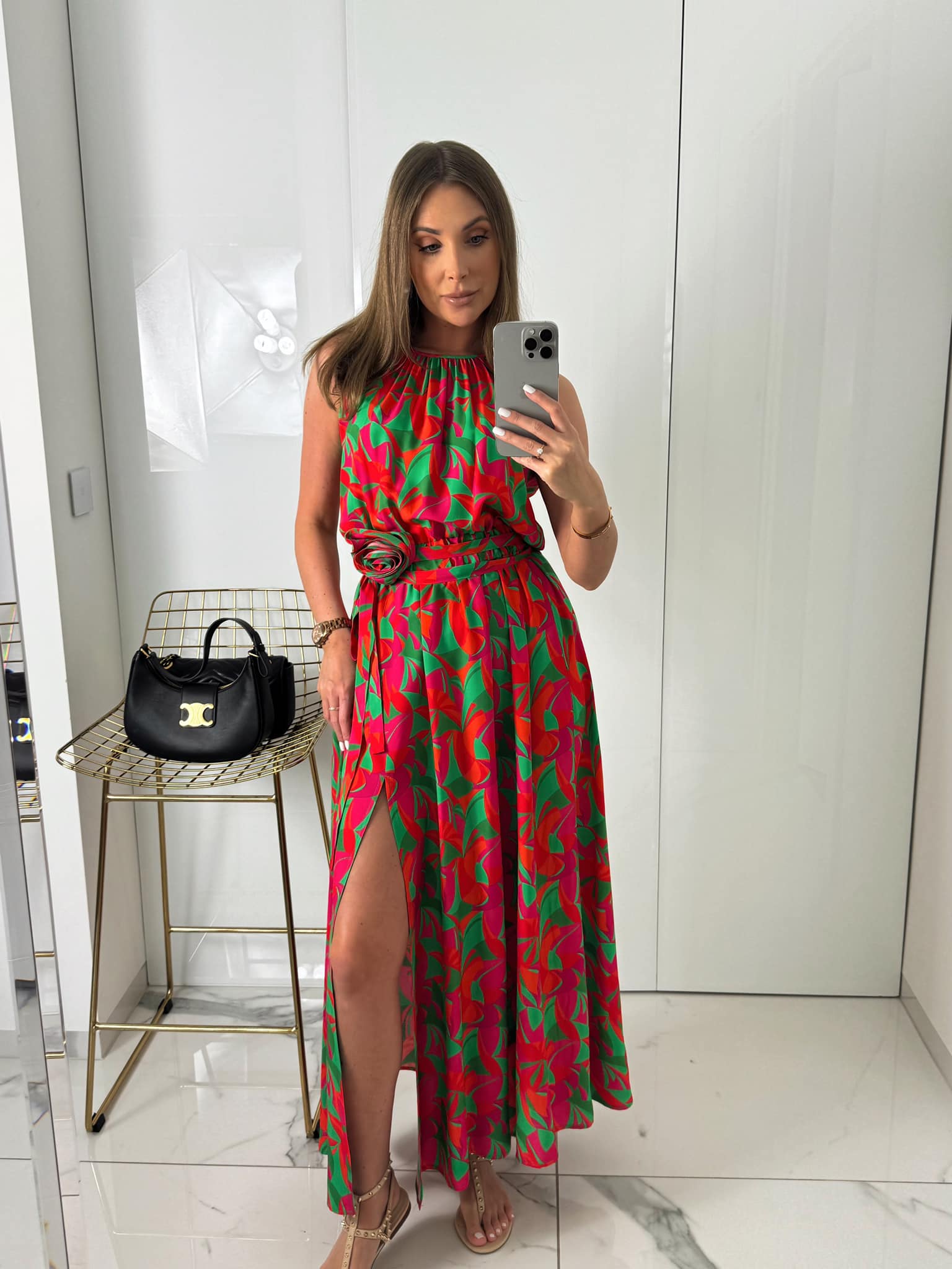Długa, bez rękawów, z delikatnym rozcięciem na nodze, niezwykle efektowna.