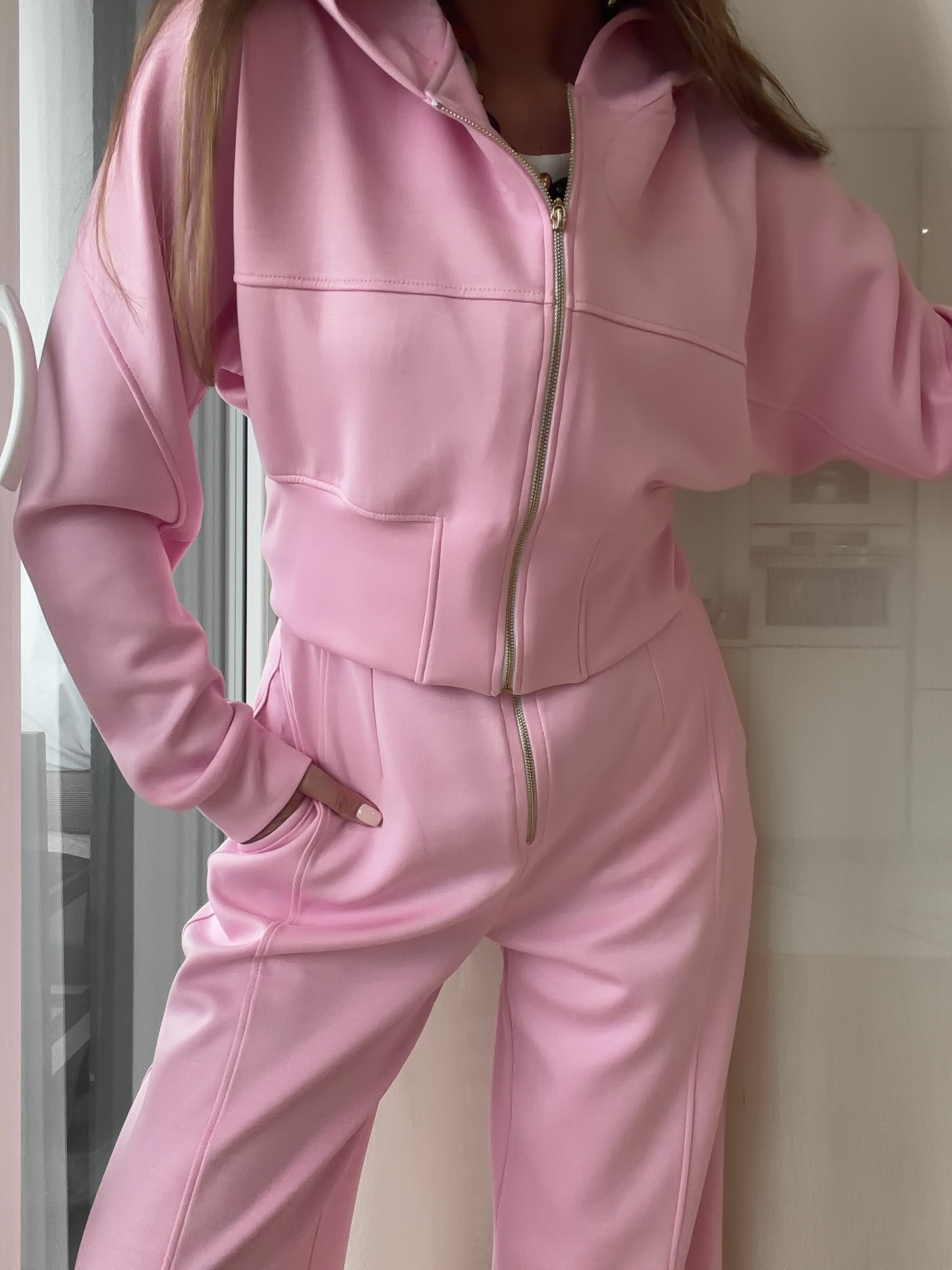 Ten różowy dres to must-have dla kobiet ceniących sobie połączenie wygody i stylu, świetnie sprawdzi się jako baza do wielu codziennych stylizacji.