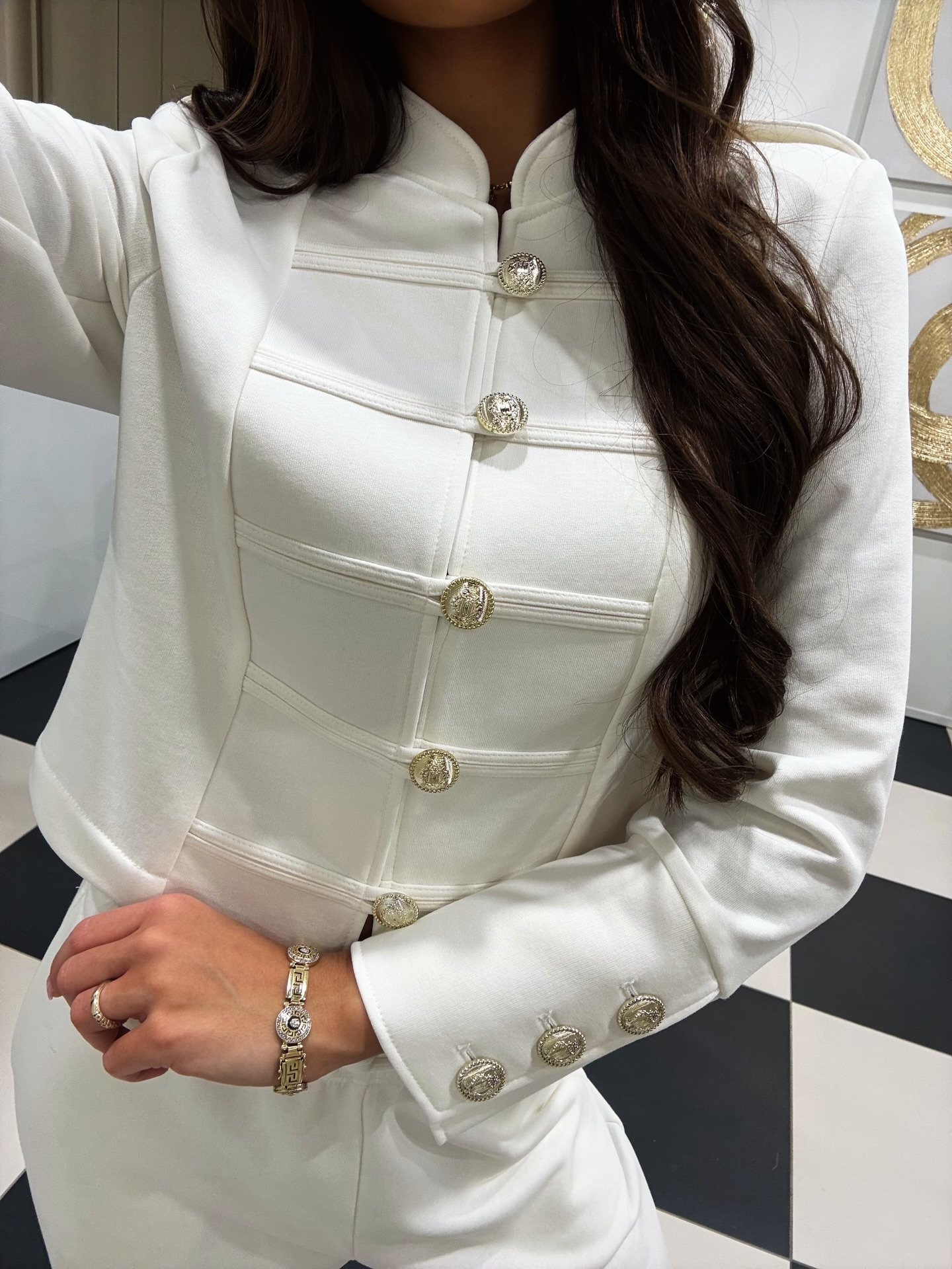 Marynarka marki Livi to wyjątkowe połączenie elegancji, ponadczasowego stylu i najwyższej jakości wykonania. Model w odcieniu klasycznej bieli wyróżnia się dopracowanymi detalami oraz subtelnymi, ozdobnymi guzikami w złotym kolorze, które nadają całości luksusowego charakteru.