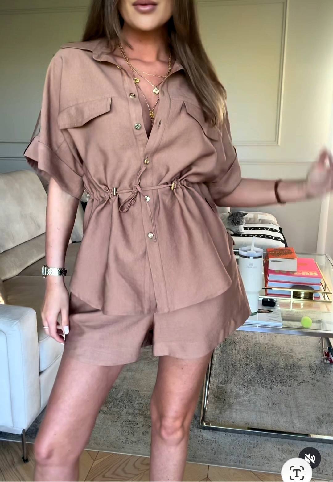 Odkryj nasz wyjątkowy komplet RIMINI, który łączy w sobie elegancję i komfort. Wykonany z przewiewnego, lekkiego materiału, idealnie sprawdzi się zarówno w ciepłe dni, jak i podczas wieczornych wyjść. Koszula o oversize’owym kroju z efektownym ściągaczem w talii pięknie podkreśla sylwetkę, a luźne szorty zapewniają pełną swobodę ruchów.